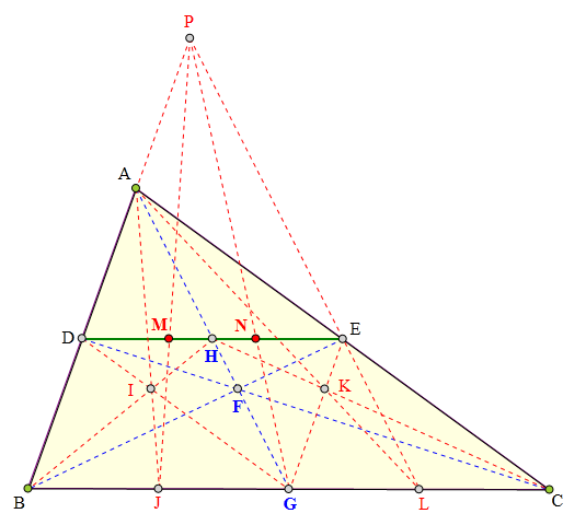 连接BE、CD交于F,连接AF交DF与H、交BC与G。连接DG、BH交于I,连接AI交BC于J,连接EG、CH交于K,连接AK交BC于L,连接EL交AB于P。连接PJ交DE于M。连接PG交DE于N。则M、N为DE的三等分点。