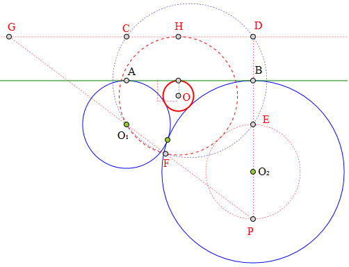 设⊙O₁、⊙O₂半径分别为r₁、r₂,且r₂>r₁,作O₁关于直线AB的对称点C,过C作CD//AB交O₂B于D,以O₂为圆心r₂-r₁为半径作圆交O₂B于E、P,则题目演变为第621题的作图题:即过点O₁作⊙O与CD、⊙O₂相切,回到本题:以O为圆心,O到AB距离为半径作圆,则此圆为所求.